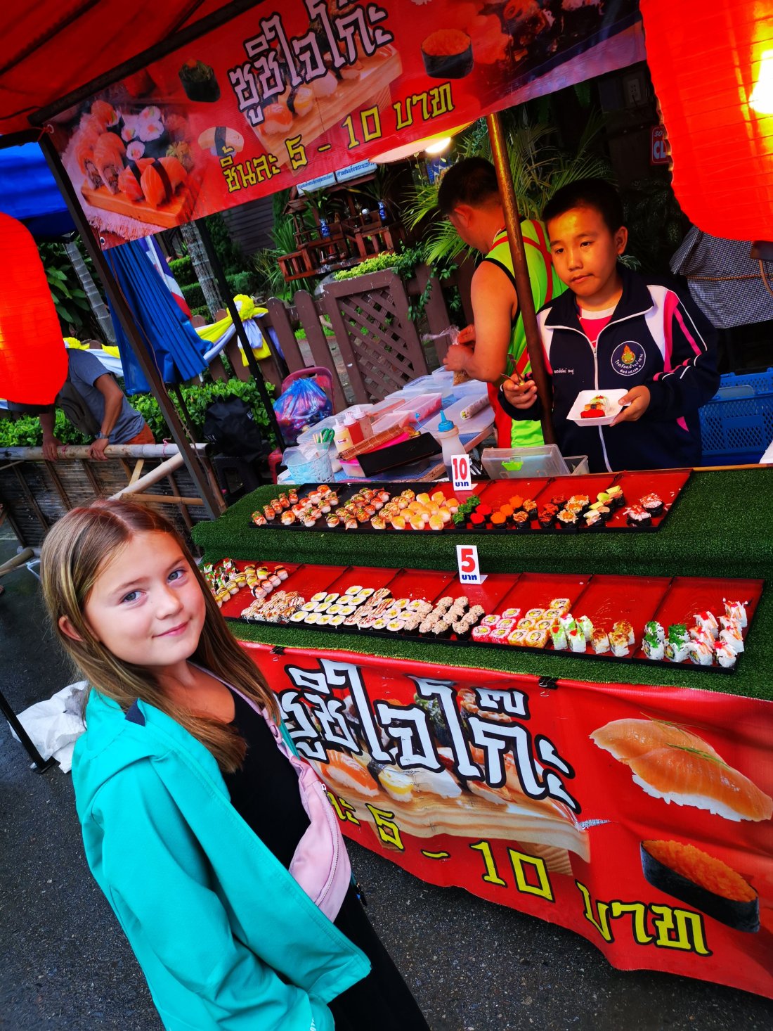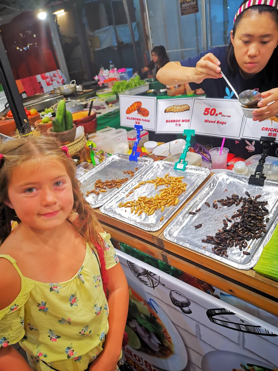 En av Theas beste sitater på turen, så langt: «mamma, vi må prøve alt som verden har å by på». Jeg er så enig, men alle disse gresshoppene og silkeormene kan jeg spare meg for.