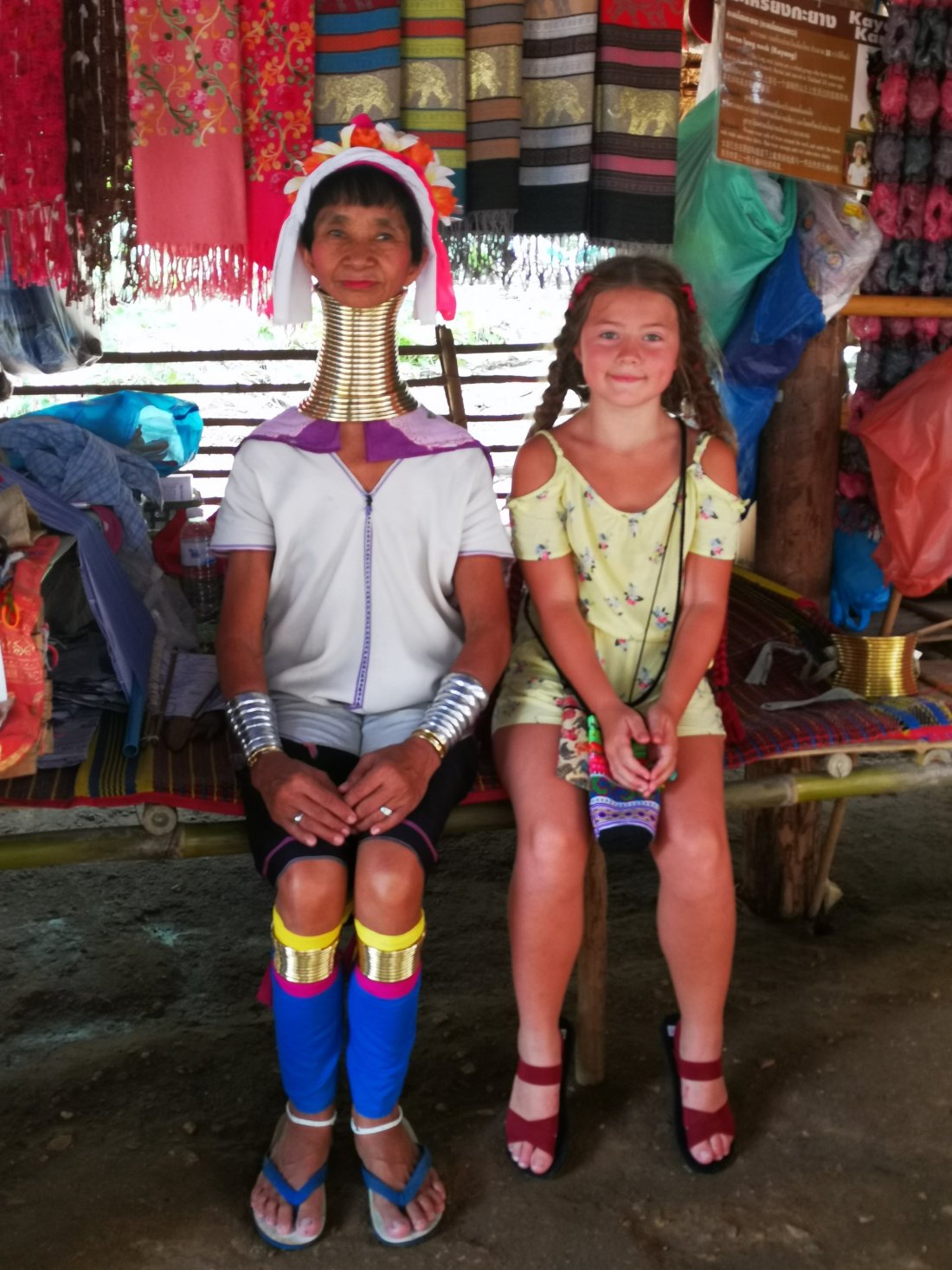 Fortsatt et mysterium for oss hvordan de får satt ringene rundt halsen. Kvinnen vi snakket med, fortalte oss at hun fikk første ringen sin som 4 åring. Vi fikk kjenne på messingringene, og de var skikkelig tunge, helt utrolig at de makter å ha dette rundt halsen hele livet. Vi trodde ringene ble brukt til å strekke halsen, men de brukes til å trekke kravebeinet nedover.