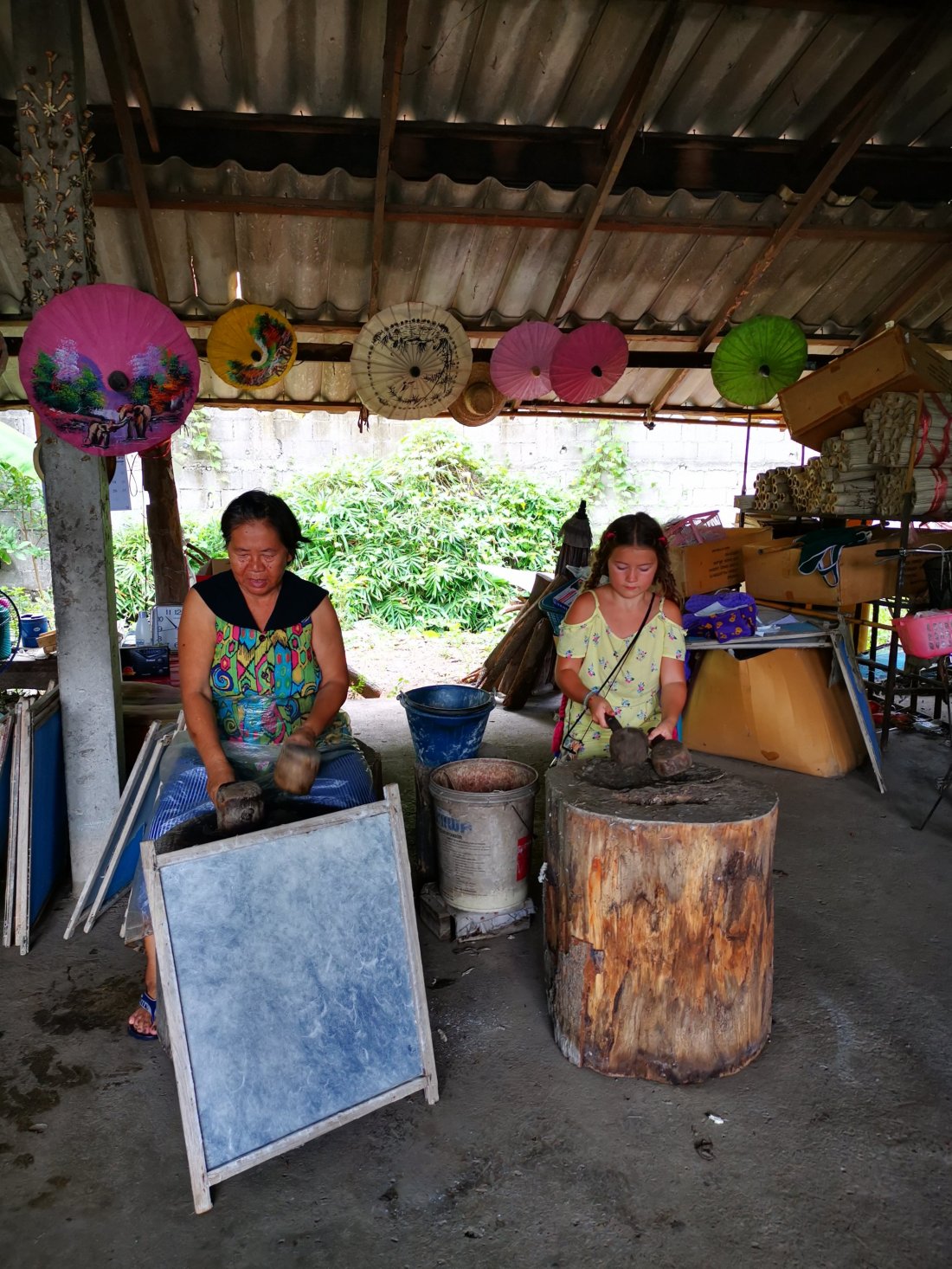 Vi fikk også overvære og delta i produksjon av flotte Thaiparaplyer produsert av papir som Thea fikk være med å lage.
