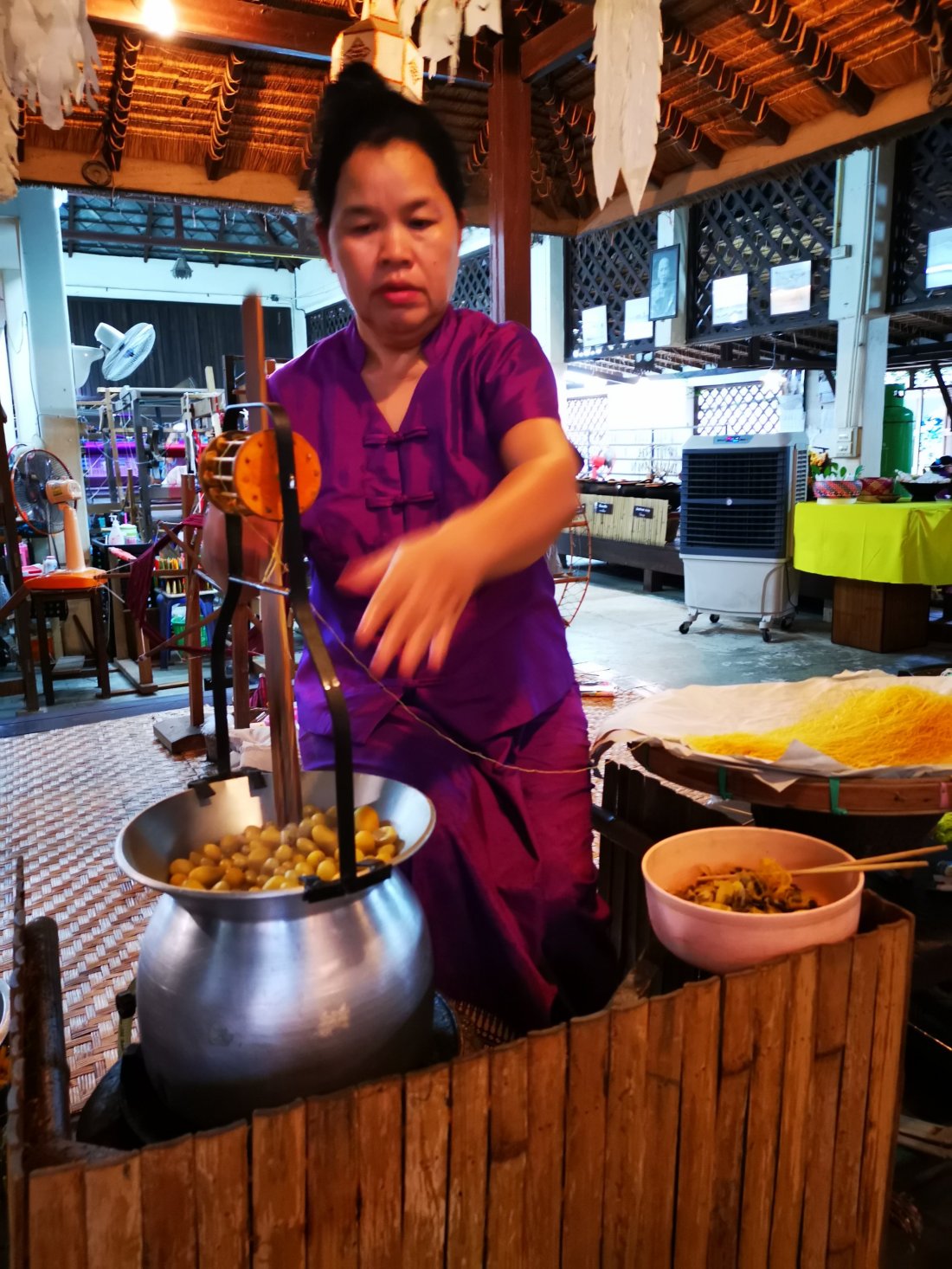 Dagen etter å ha spist silkeorm, leide vi oss en tuk og tuk og kjørte rundt i byen for å se de fleste severdighetene, og som ellers i Thailand, måtte vi innom et marked eller 10. Jeg #### slike turistmarkeder, men vi gjorde en meget interessant oppdagelse på et av markedene. Thai silke produseres nemlig av en av ormene som Thea liker å spise. Interessant!!
