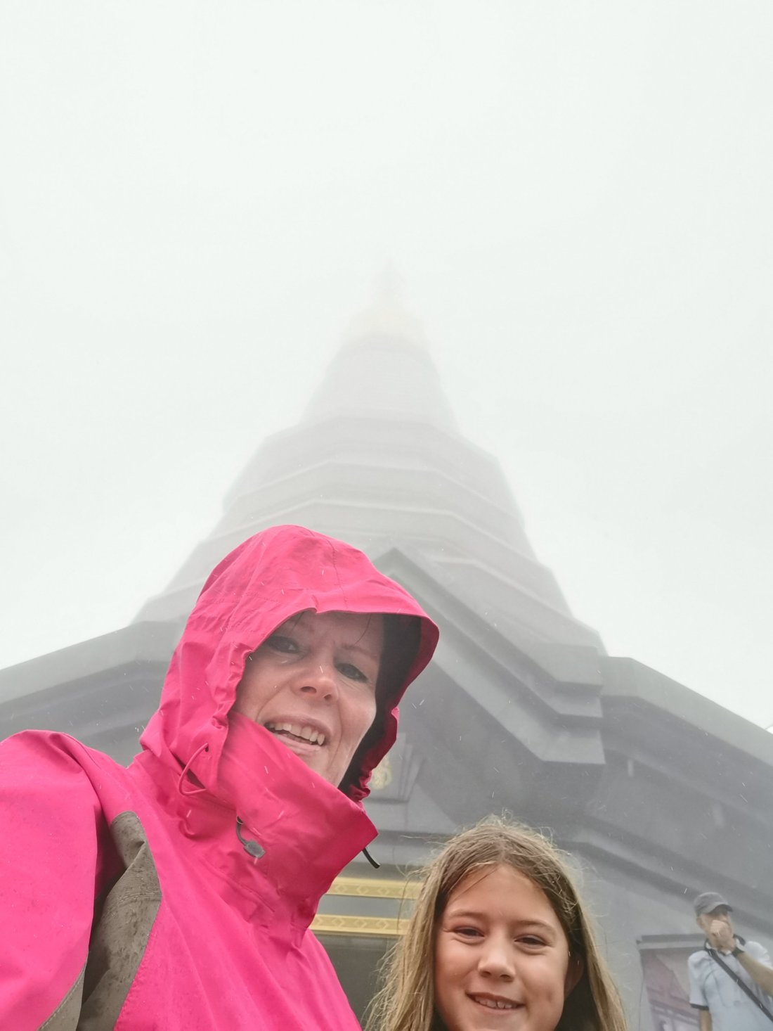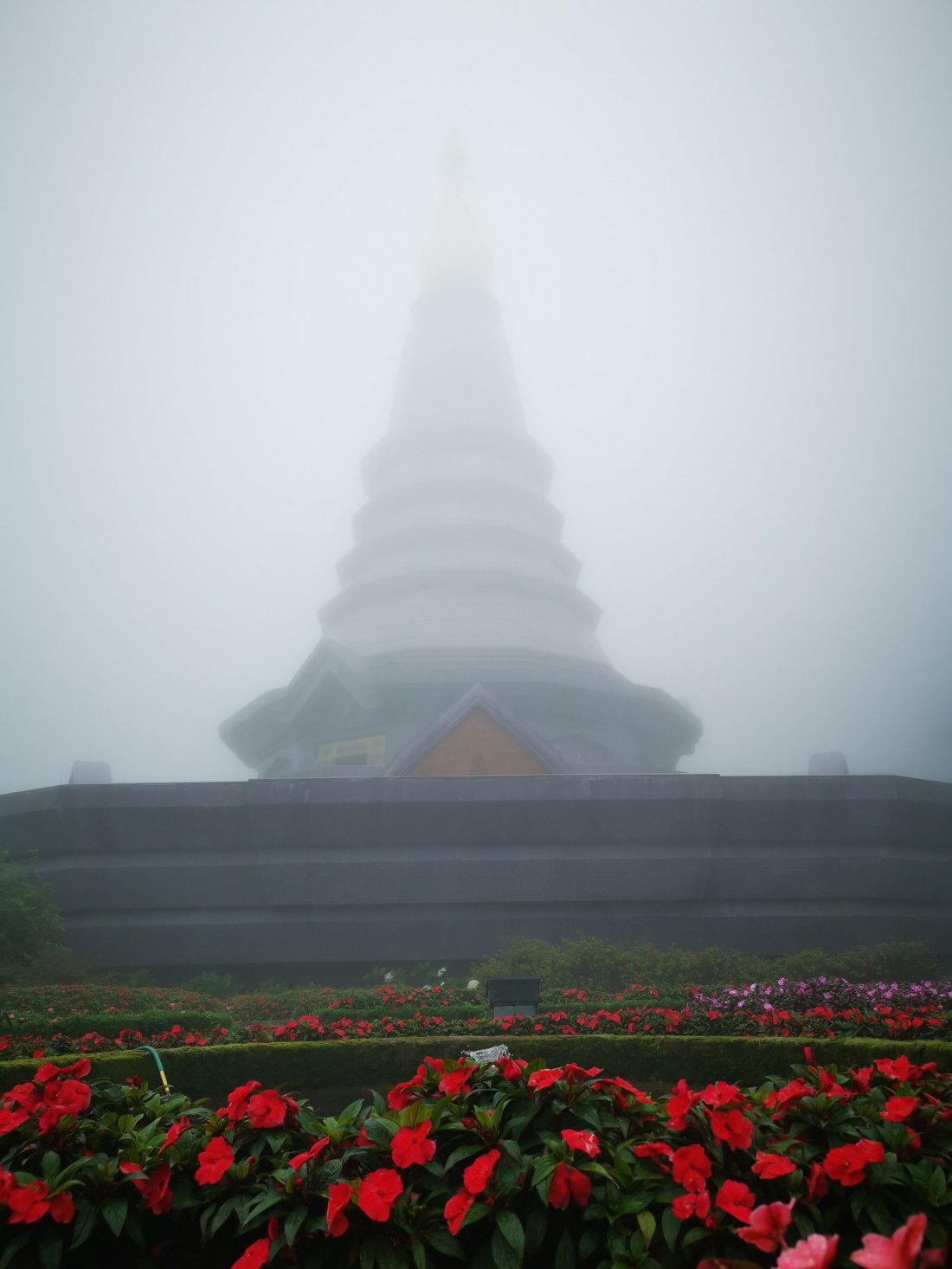 Ved toppen av Doi Inthanon ligger det to chedier dedikert til deres kongelige majesteter, kongen og dronningen. Chedisene ligger på to bakketopper, rundt 100 meter fra hverandre. De ble reist for å minne om kongen og dronningens 60-årsdag. Begge chedisene inneholder buddhaer. Jeg tror utsikten er fantastisk her på en flott solfylt dag, men det var tett tåke på vår dag. Men fint alikevel.