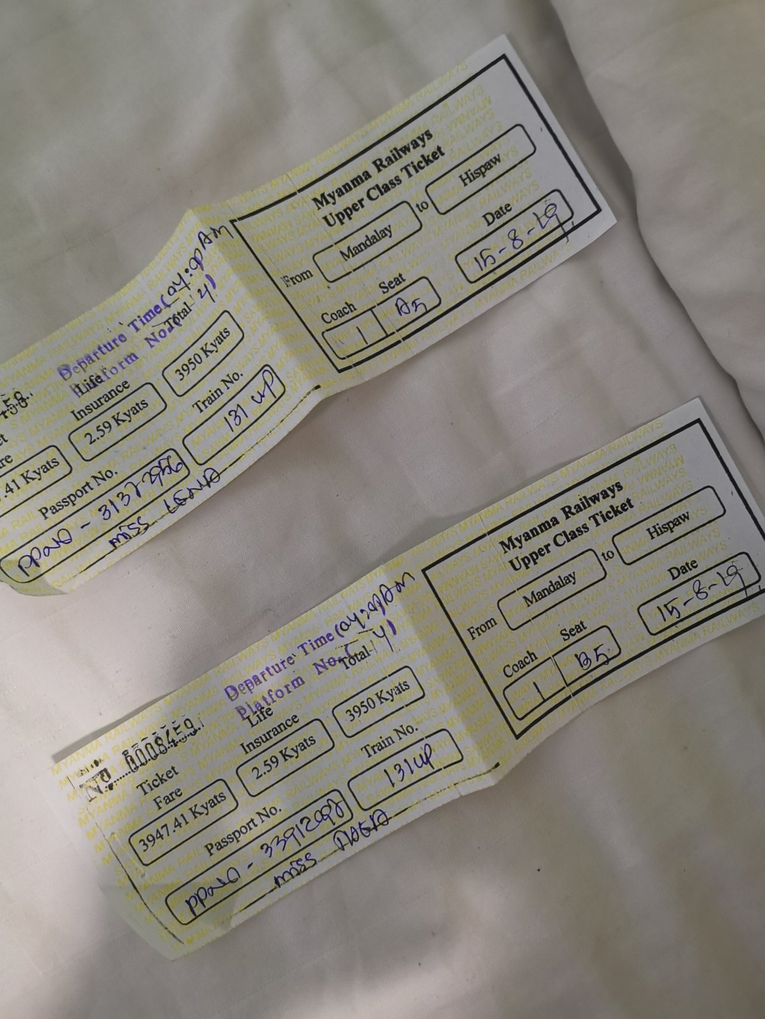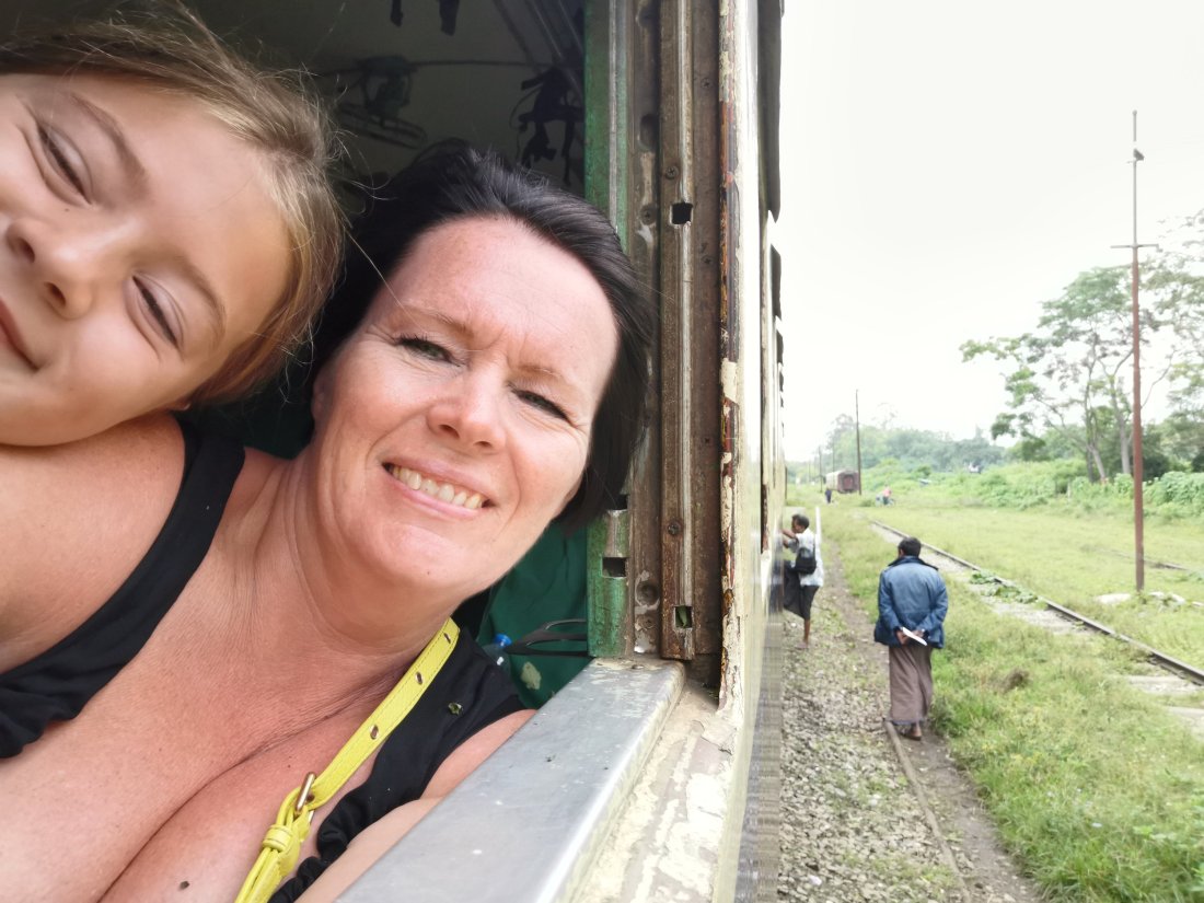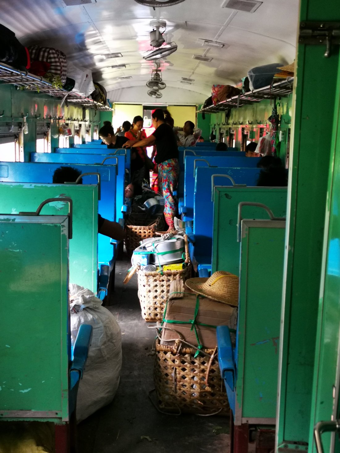 Vi valgte å reise med Upper Class, hvor det var godt med plass til beina, og vi fikk vindusplass. Det var ikke trengsel slik som i Sri Lanka, her fikk vi iallefall puste. Setene var komfortable å sitte i, så ingenting å utsette på komforten i Myanmarske tog.