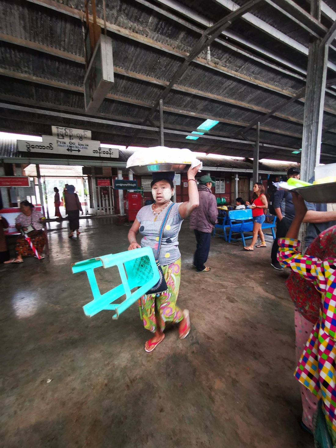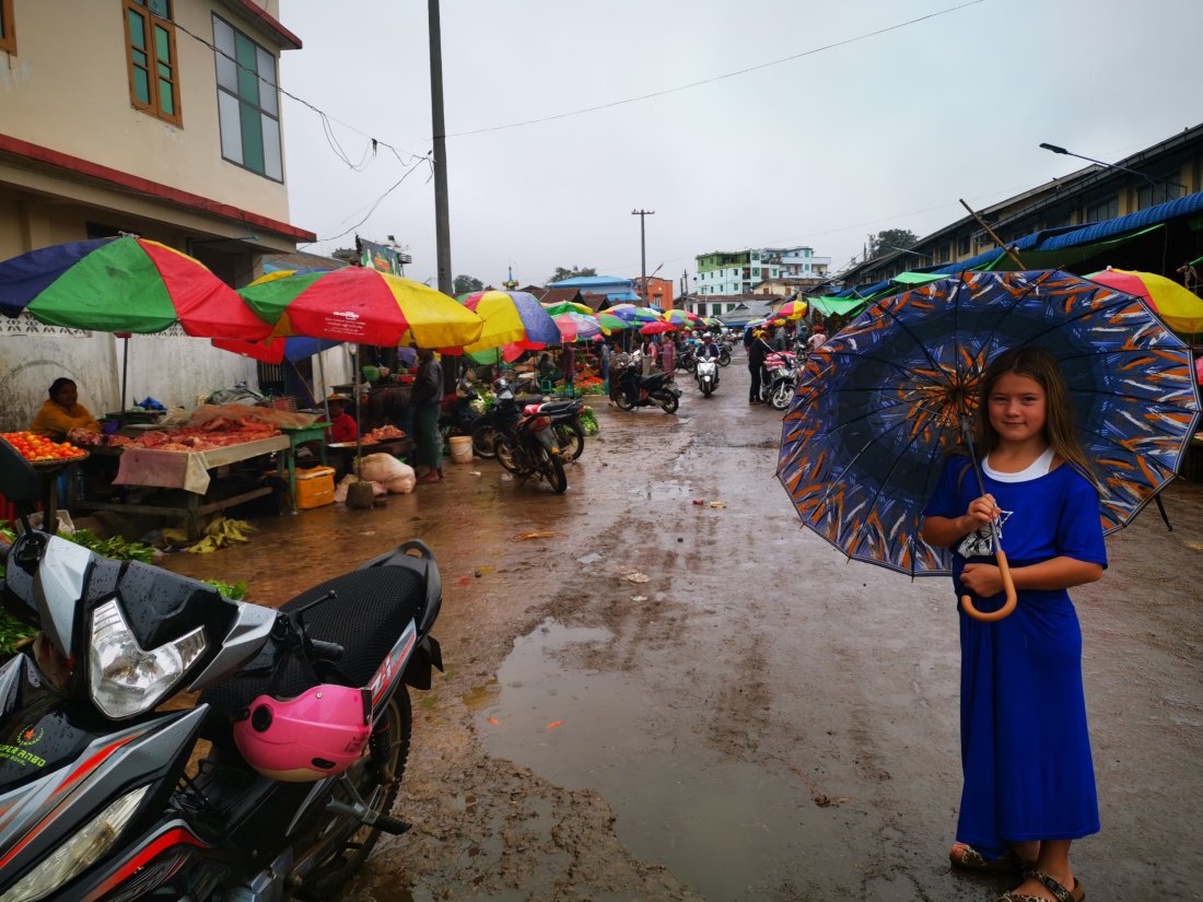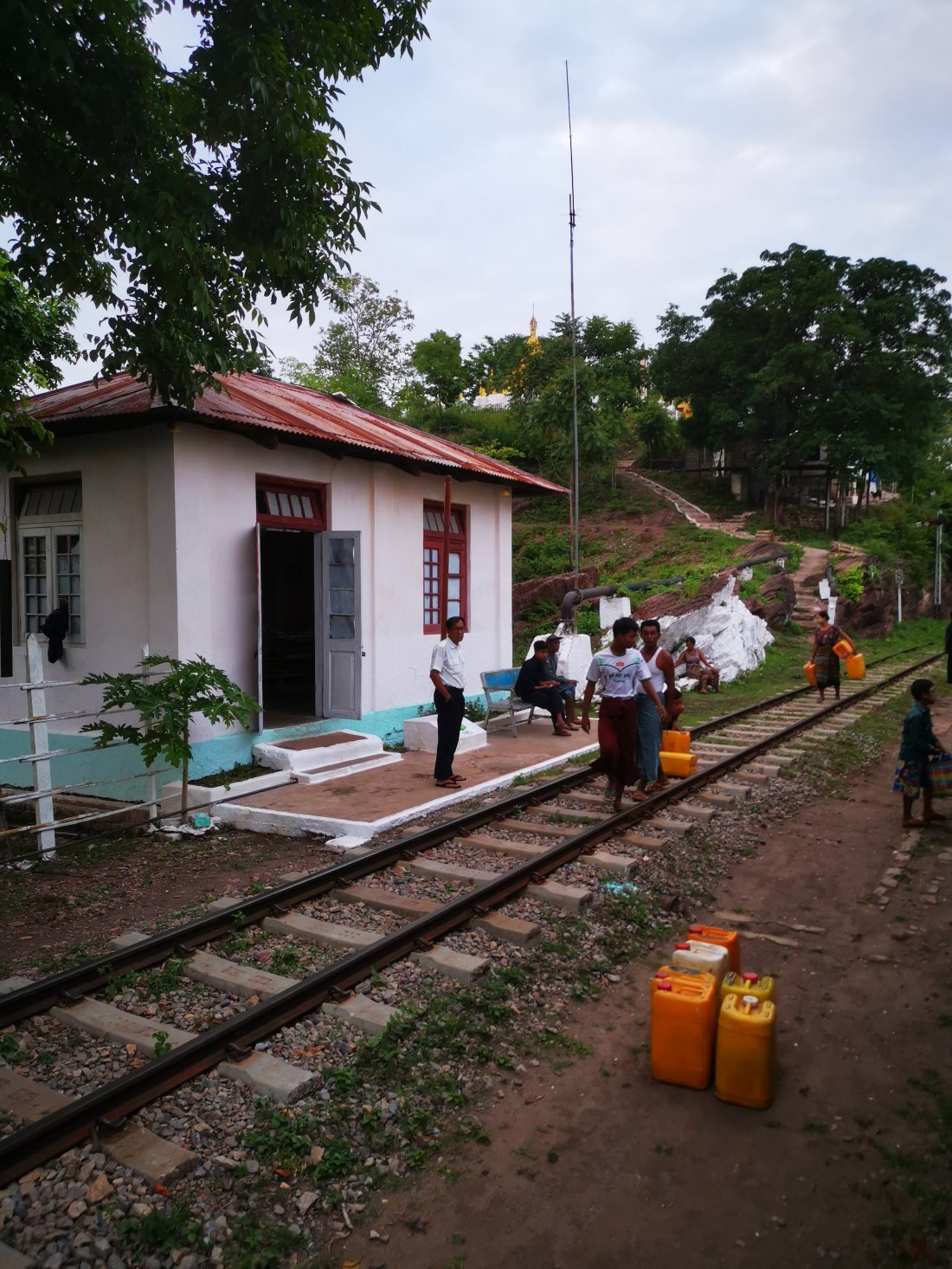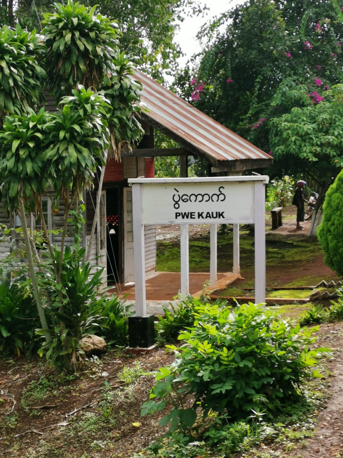 Etter å ha stoppa en liten time i Pyin oo Lwin, hvor vi fikk kjøpt oss deilig ananas, gikk endelig turen videre, og vi var klare for å komme oss til Hsipaw. Etter en liten time stopper toget ved en liten landsby og vi blir stående rolig i en god stund, ingenting er unaturlig ved det, vi hadde lest oss opp på at det kunne ta tid å ta tog i Myanmar. Etter nok en halvtime så begynner vi passasjerene å undre oss over hva som skjer. Vi begynte å bli sultne, og da gir konduktøren oss beskjed om at vi trygt kan gå å kjøpe oss snacks i byen. Vi var redde for at toget skulle dra ifra oss, så vi løper ned til byen, og løper tilbake med snacksen… Nyter en pose snacks, mens vi håper å forlate perrongen snart. Men neida, enda en time går, og vi får ny beskjed om at vi gjerne kan gå og spise lunsj… Vi tenker at jaja, sikkert noe feil med toget, så vi går på nærmeste restaurant, setter oss ned og bestiller lunsj. Der møter vi noen andre fra toget som forteller oss at de hadde blitt fortalt at det var «dangerous» å reise videre med toget. Jaja, sikkert en del som mangler som de må bestille opp for at vi skal komme oss videre. jaja, sånn er det når vi reiser med tog i Myanmar. Etter å inntatt en deilig lunsj, går vi tilbake til toget atter en gang og håper at vi er klare for å reise videre snart.