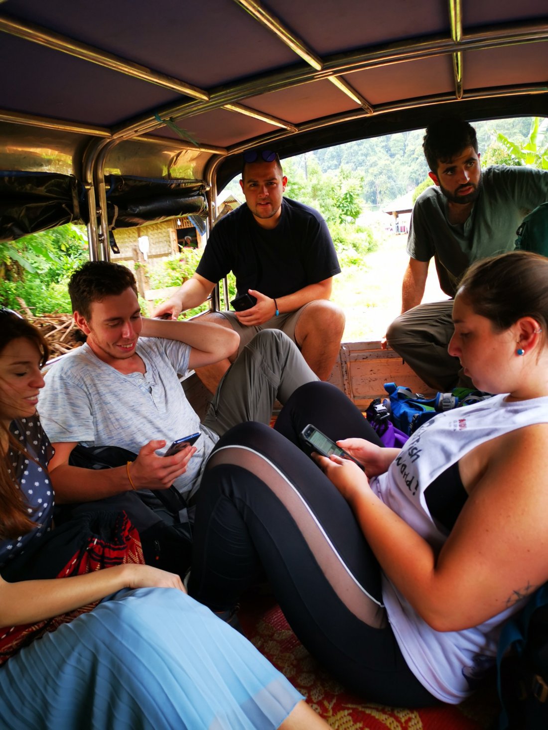 Vi går tilbake til toget og setter oss ned i setet, da en burmesisk medpassasjer kommer og gjør tegn om at det er skyting og «pow», bomb up there. What?? Dette var vi ikke forberedt på, eller, vi vet at vi reiser i Myanmar, men trodde at vi var i et sikkert område. Vi er flere backpackere som undrer oss over hva vi skal gjøre videre, togkonduktørene aner heller ikke hva de skal foreta seg. Vi blir stående på perrongen i enda et par timer, før en kar informerer oss om at han vurderer å bestille en bil slik at vi kan returnere til Pyin oo lwin. Toget kommer ikke til å kjøre videre, iallefall ikke denne dagen. Vi blir med å spleiser på bil.