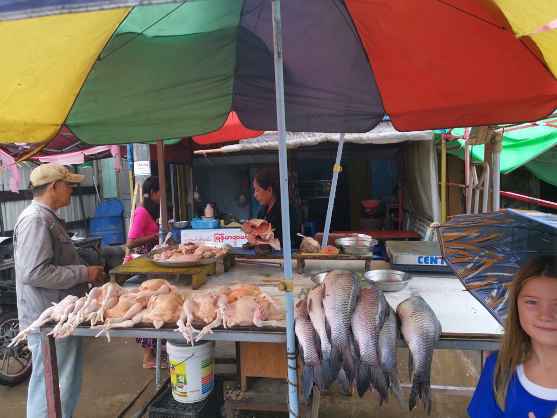 Marked finner vi overalt i Myanmar, med fersk flådd høne og nyfiska fisk.