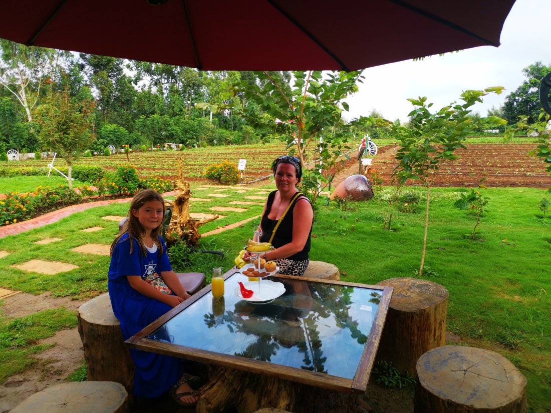 Kom over en økologisk gård, hvor vi fikk servert hjemmelaget pasjonsfruktjuice og hjemmebakte muffins… Mmm…..Thea fikk hilst på kaninene.