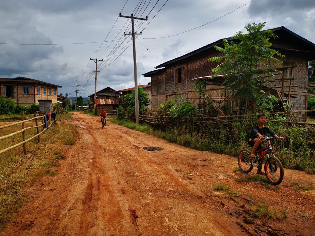 Vi gikk mellom små landsbyer og rismarker, hvor arbeidende kvinner og små barn ropte ming-gah-lah-bahr til oss, som er en hilsen på burmesisk.