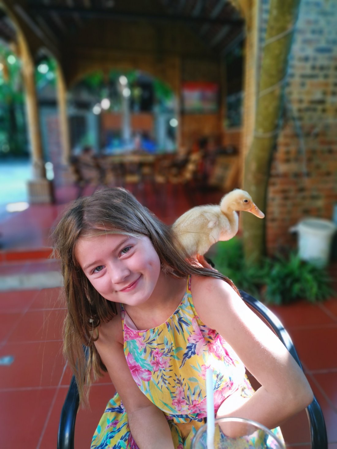 Heldigvis snakker Thea godt engelsk, så hun fant seg noen å dra på tur sammen med, mens jeg kooooste meg på lugaren.Tilbake til Hanoi etter endt cruise, tok vi turen til Tam Coc, der skulle det være vakkert. Fortsatt influensa, men nå måtte den gå over snart. Vi hoppa på bussen og booka oss inn på Tam Coc Mountain Lake Homestay, og der ble jeg i senga, mens Thea lekte med barna i huset, og en andunge.