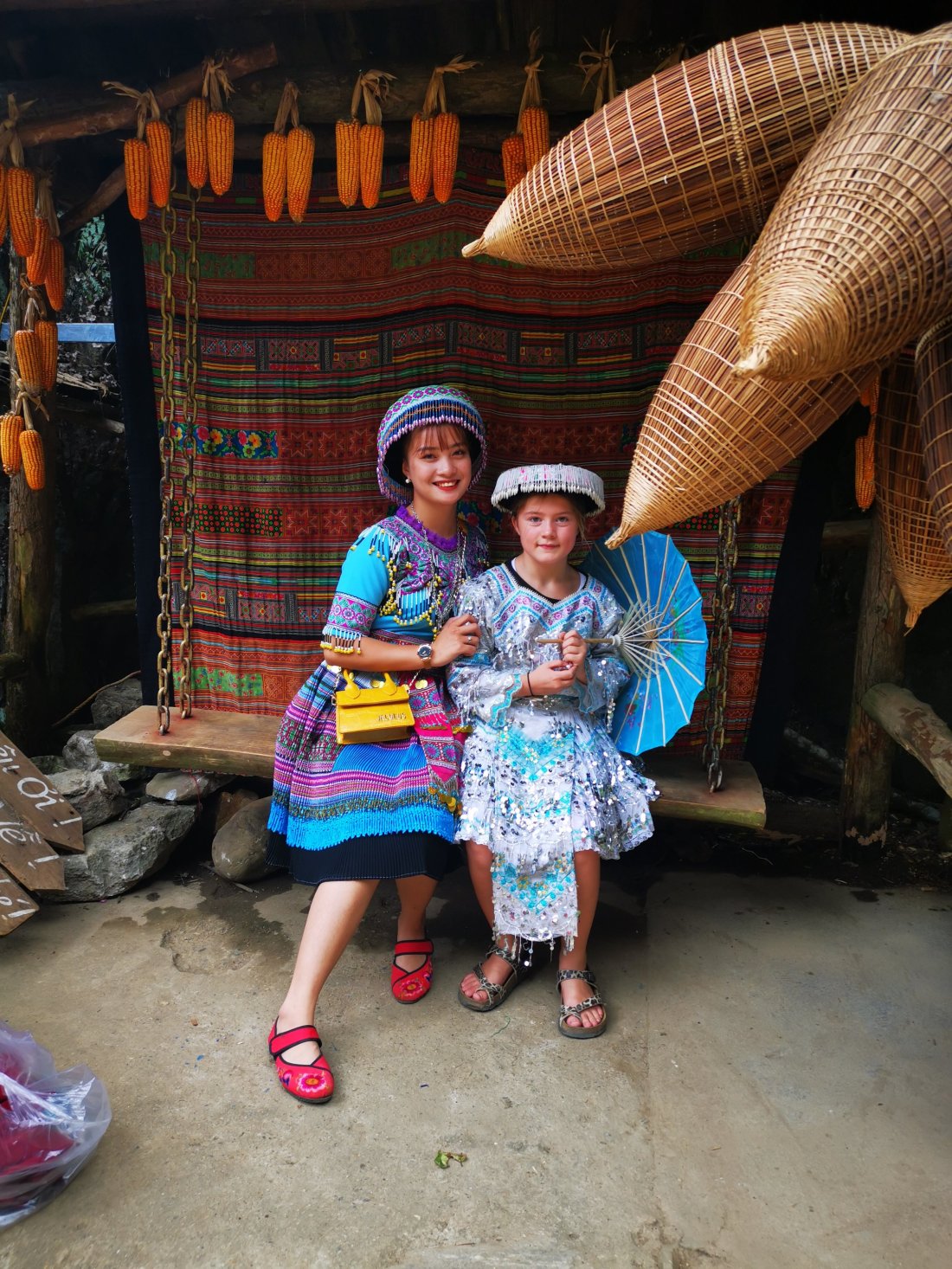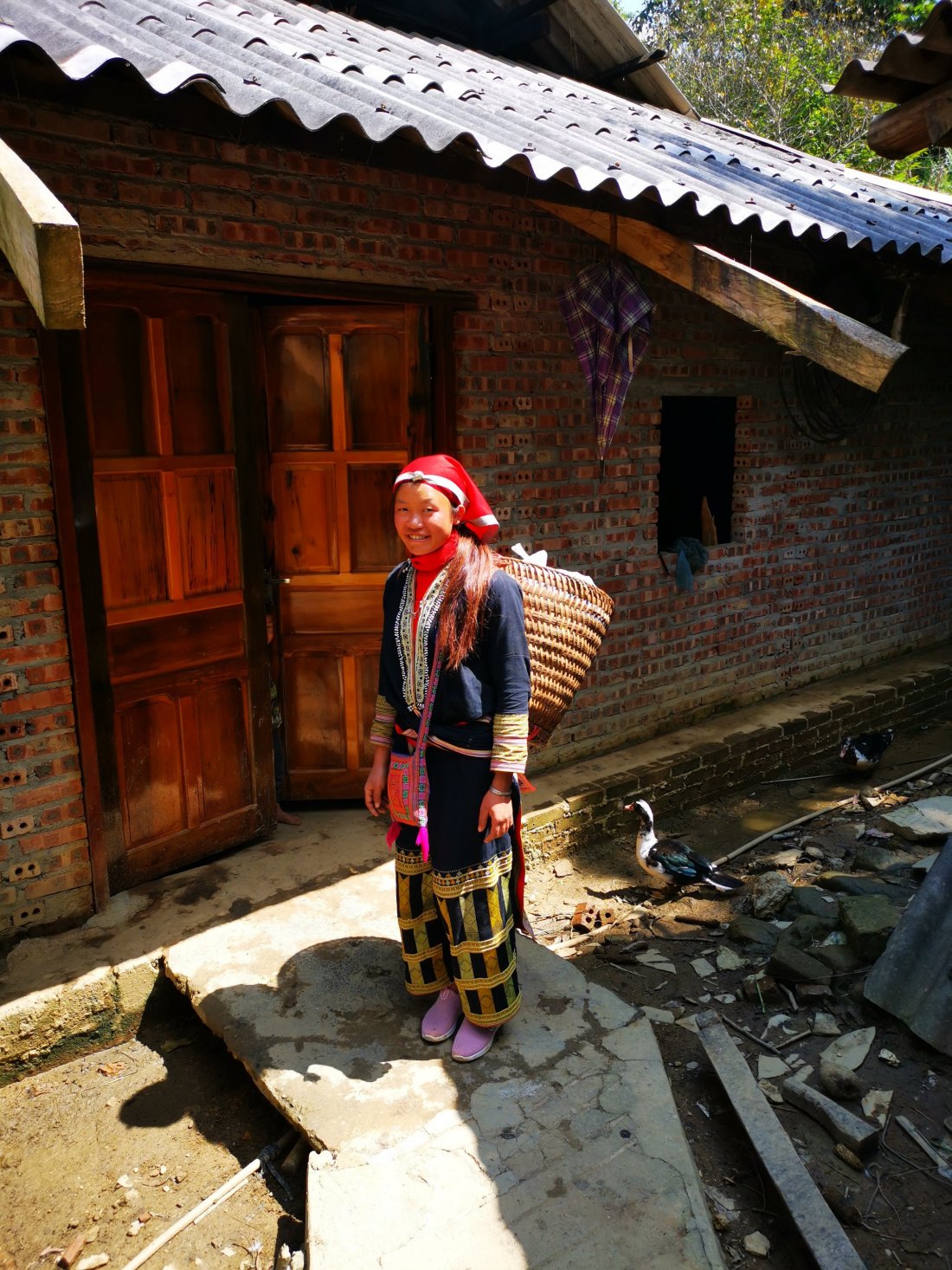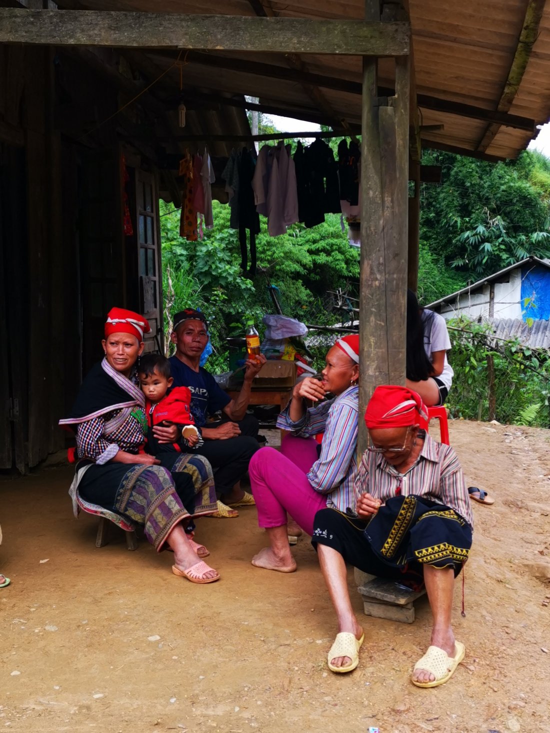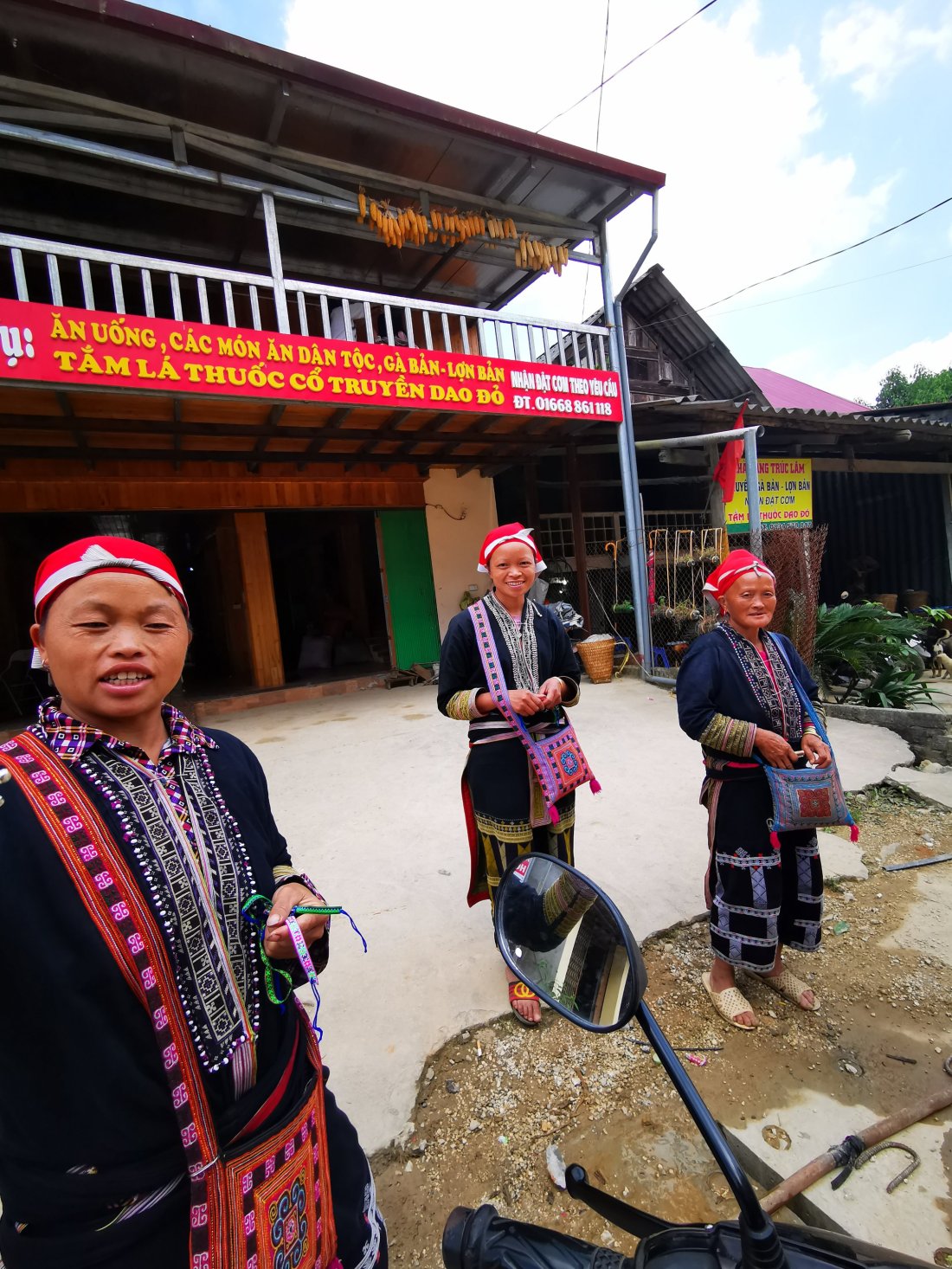 Dette er en del av den etniske gruppen; Red Dao, navnet har de pga de røde luene. De kler seg i flotte håndbroderte bukser og jakker, med lange skjerf som de knytter rundt midja. Og et rødt skjerf som de snurrer rundt håret. De snakka svært lite engelsk, men med fingerspråket fikk vi oss en bedre lunsj, en øl, litt søtt som Thea ga til barna i landsbyen… For å si det sånn, så ble vi en attraksjon, «alle» kom for å hilse på oss. Vi ble nå siitende på «restauranten» resten av dagen, med et lite hjemmebesøk hos en familie