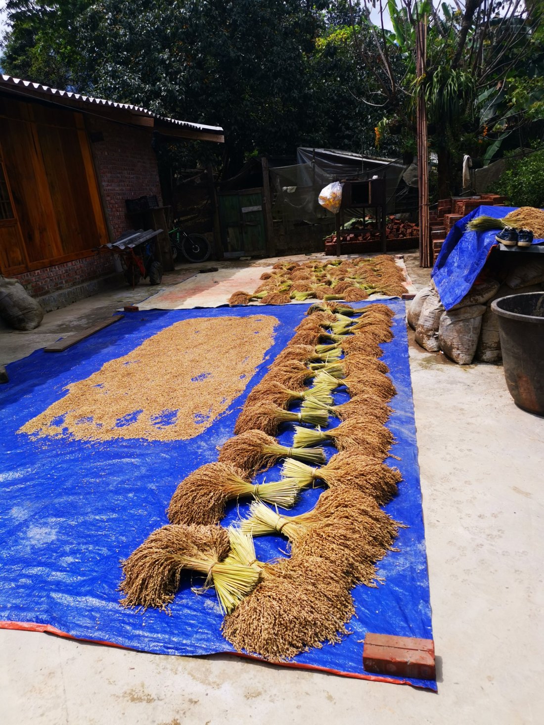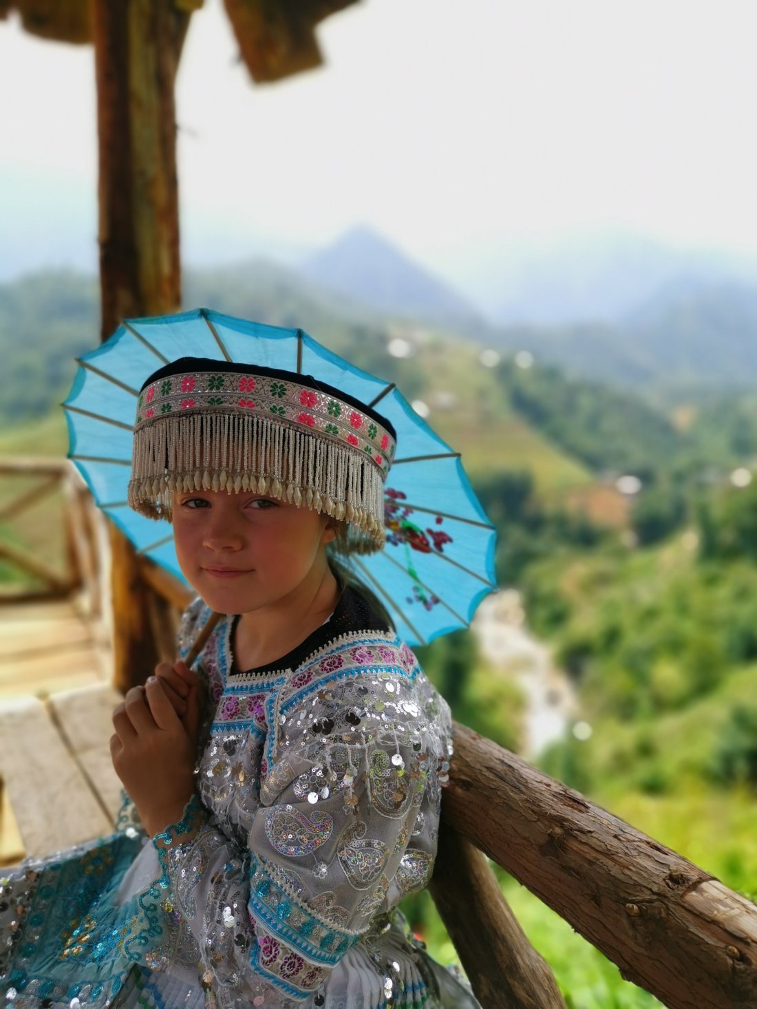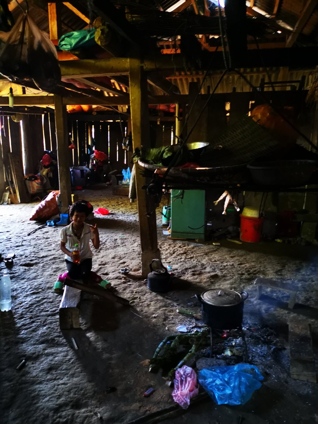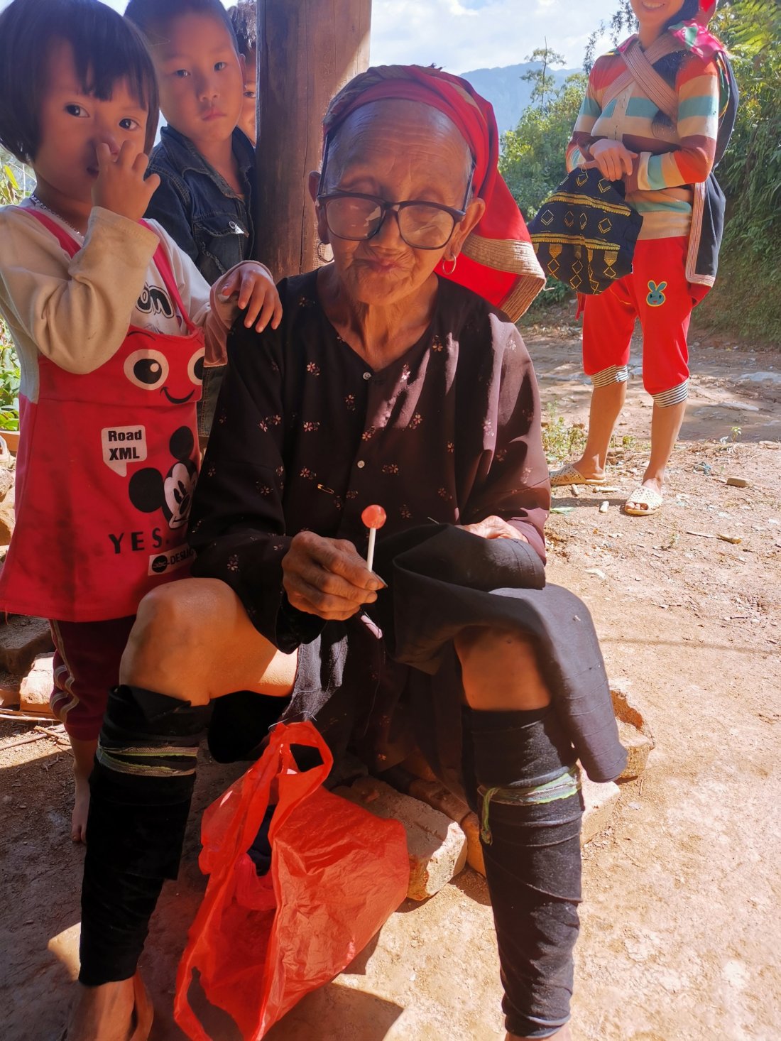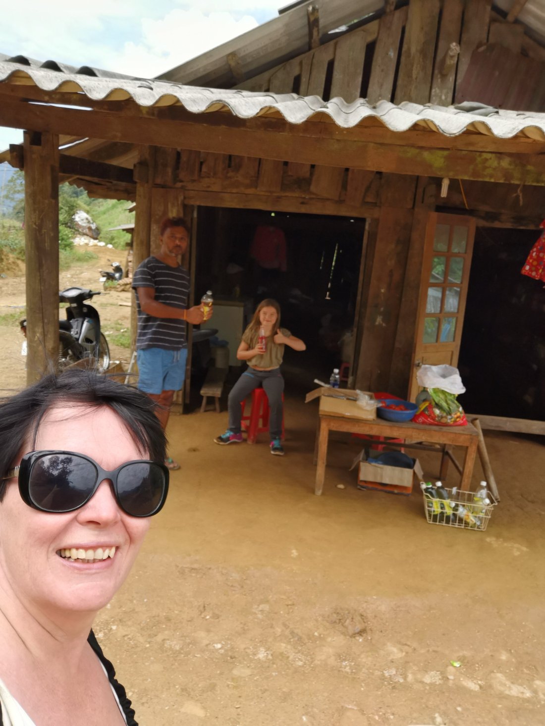 Dette er en del av den etniske gruppen; Red Dao, navnet har de pga de røde luene. De kler seg i flotte håndbroderte bukser og jakker, med lange skjerf som de knytter rundt midja. Og et rødt skjerf som de snurrer rundt håret. De snakka svært lite engelsk, men med fingerspråket fikk vi oss en bedre lunsj, en øl, litt søtt som Thea ga til barna i landsbyen… For å si det sånn, så ble vi en attraksjon, «alle» kom for å hilse på oss. Vi ble nå siitende på «restauranten» resten av dagen, med et lite hjemmebesøk hos en familie